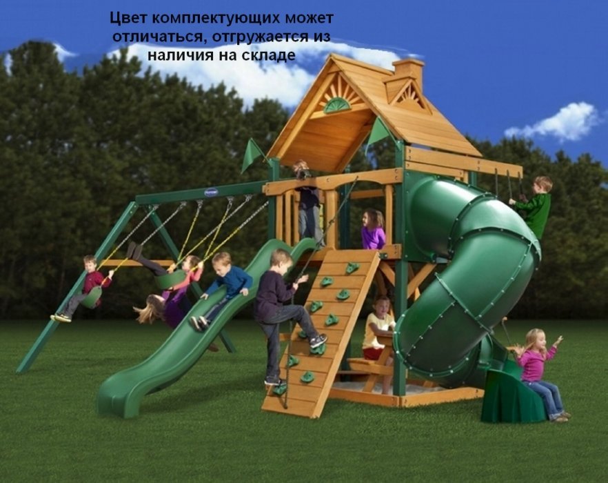 Большая детская игровая площадка Царь горы с двумя спусками и фортом под деревянной крышей с окошками и трубой. Царь горы — игровой комплекс, рассчитанный на детей в возрасте от 3 до 12 лет. Эта двухуровневая и многофункциональная площадка будет отлично смотреться как на загородном участке, так и во дворе жилого дома, детского сада или школы, в сквере или парке. Благодаря продуманной конструкции и сочетанию в одном комплексе всех видов игрового оборудования, площадка может использоваться для организации одновременного отдыха целой группы малышей разного возраста.