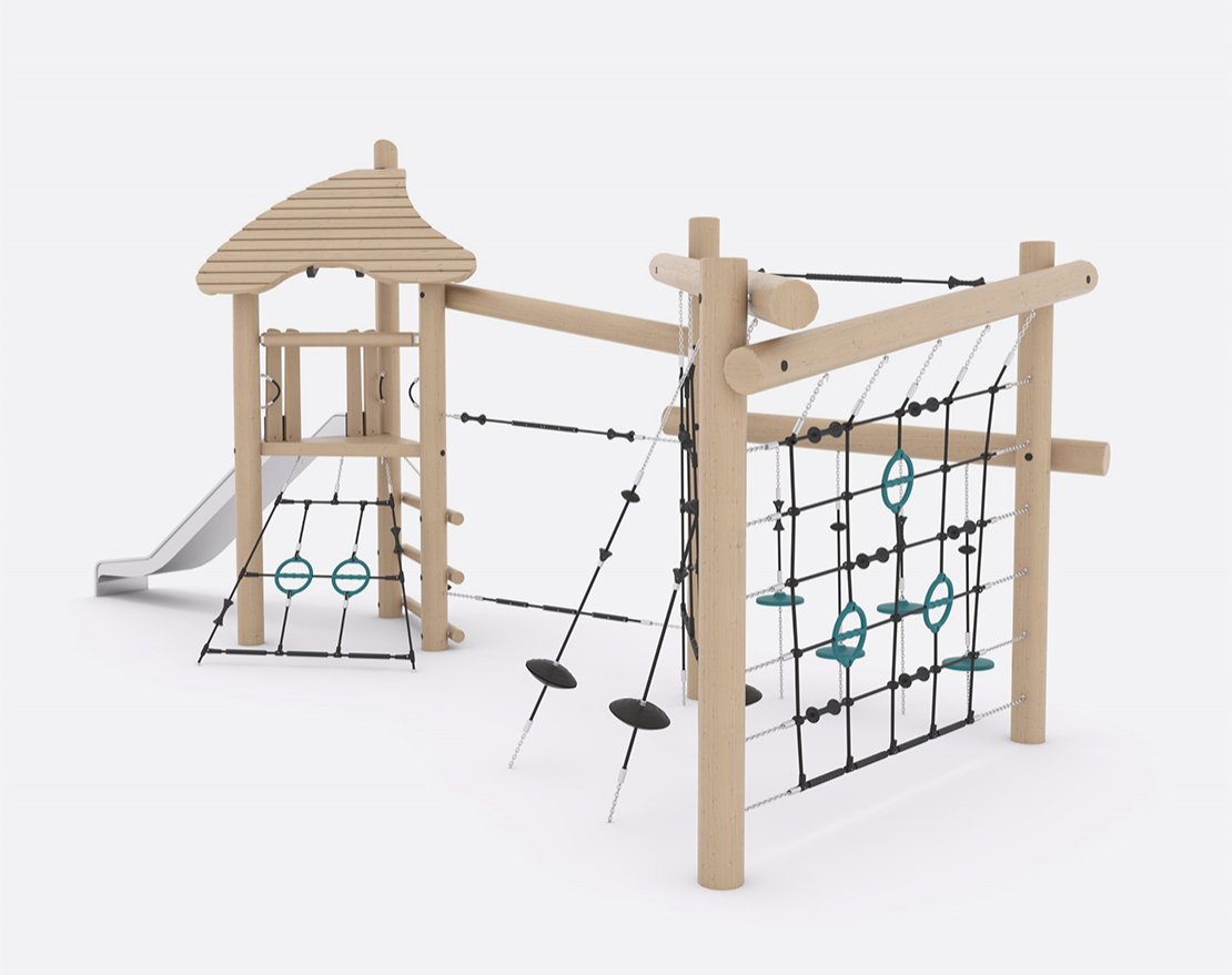Состоит из опорных стоек, перекладин, канатной сетки и металлической открытой горки с защитными бортиками. Конструкция также оснащена канатными стропами с уступами, по которым можно лазить.
