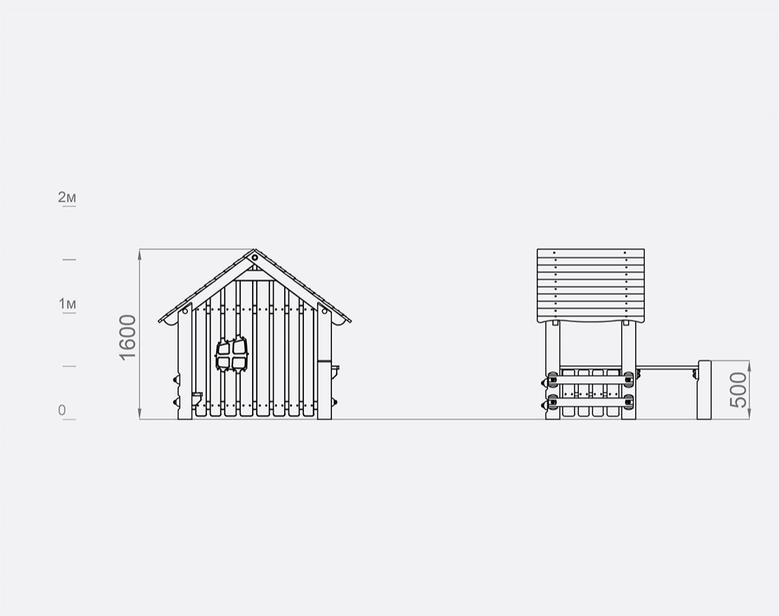 Состоит из опорных столбов и перекладин. Представляет собой домик с крышей, небольшой перегородкой, стеной с окном, скамейкой и столиком.