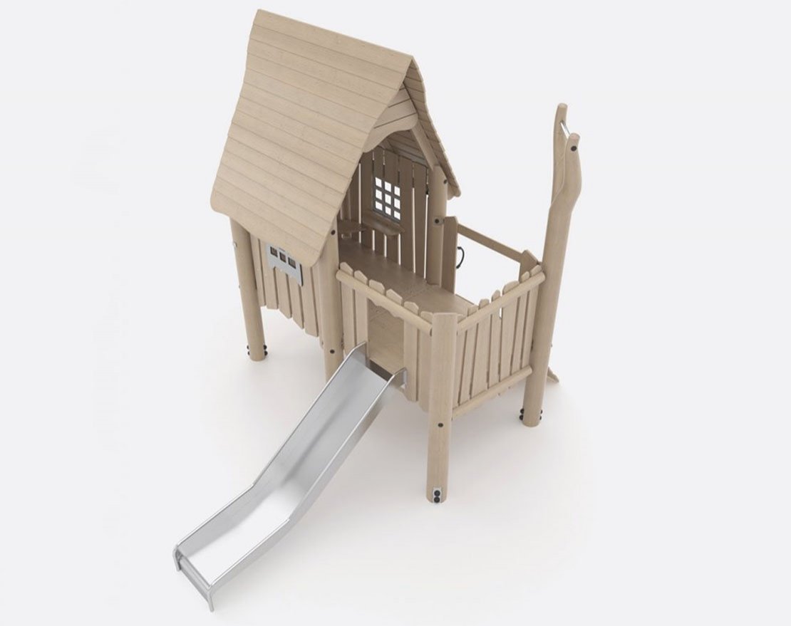 Представляет собой закрытый домик с крышей, стенами, окнами, небольшой металлической горкой с защитными бортиками и пандусом со скалодромными зацепами. Внутри домика установлена небольшая скамейка и подоконник. Для большего комфорта, конструкция оснащена ручками-стропами.