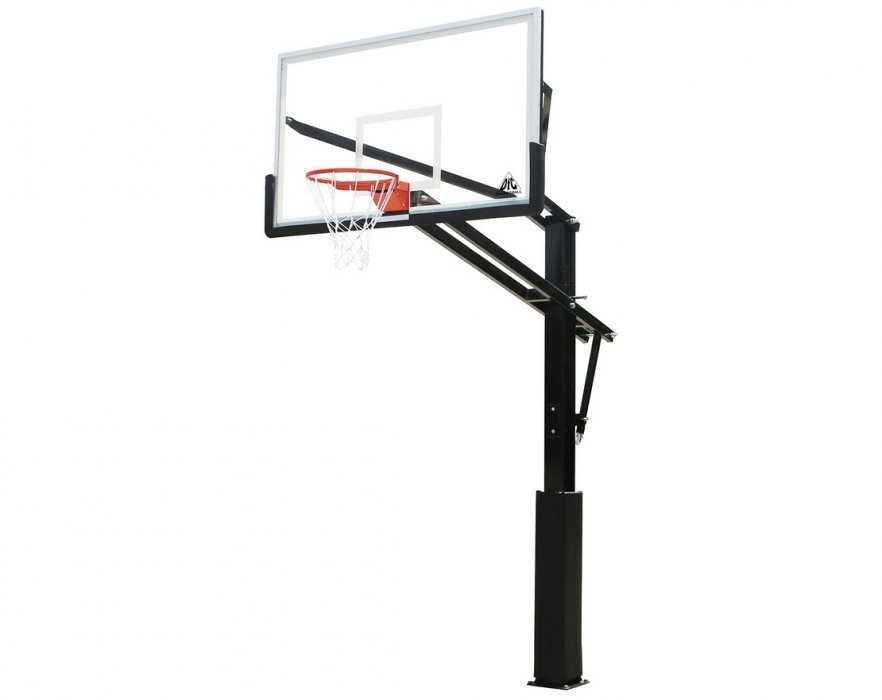 Щит изготовлен из закаленного стекла толщиной 10 мм и имеет размерность 180 х 105 см (72’’). По периметру щит имеет кант из металла. В нижней части щита и на стойке установлено защитное покрытие Poly Pade. Стойка комплектуется кольцом с амортизацией, которое выдерживает нагрузку до 300 кг в передней части. Бесступенчатая регулировка высоты с помощью ручки в диапазоне от 245 до 305 см.