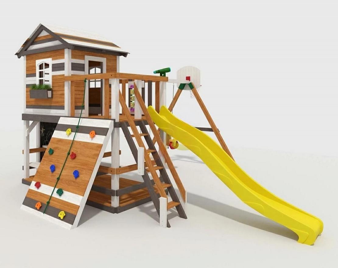 - конструкция двухуровневой башни с домиком и балконом из клееного бруса 100х100 мм;