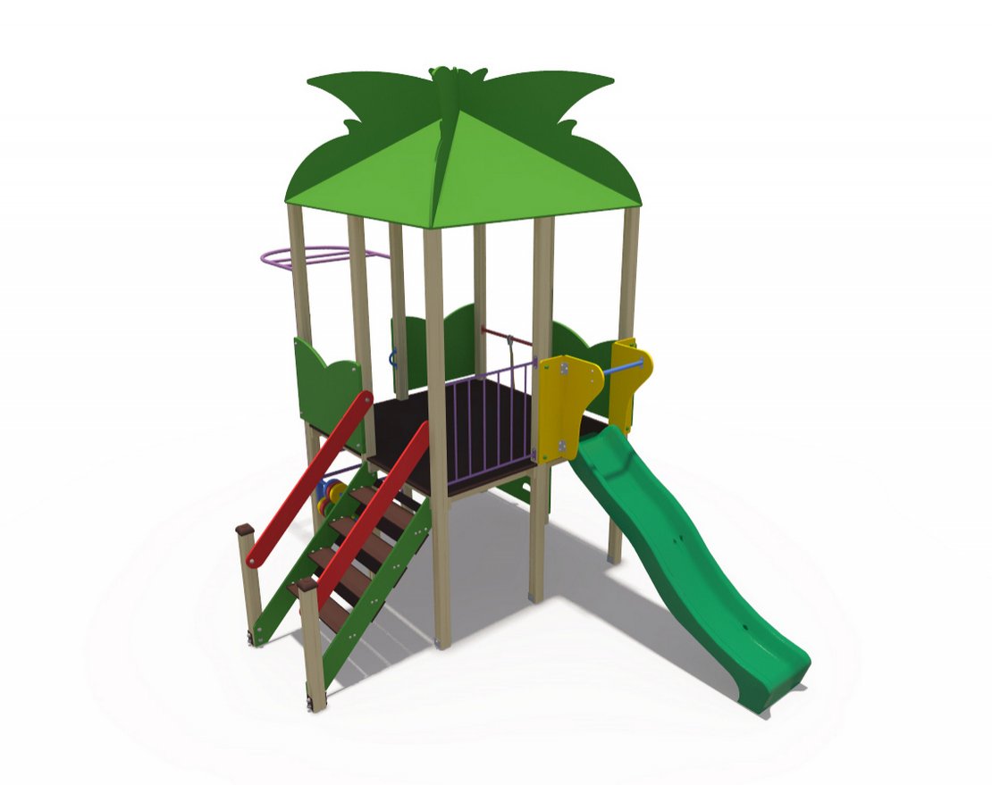 Конструкция отличается ярким дизайном, изготовлена из берёзовой влагостойкой фанеры марки ФСФ 2/2, стали марки Ст 3, клеёного бруса.