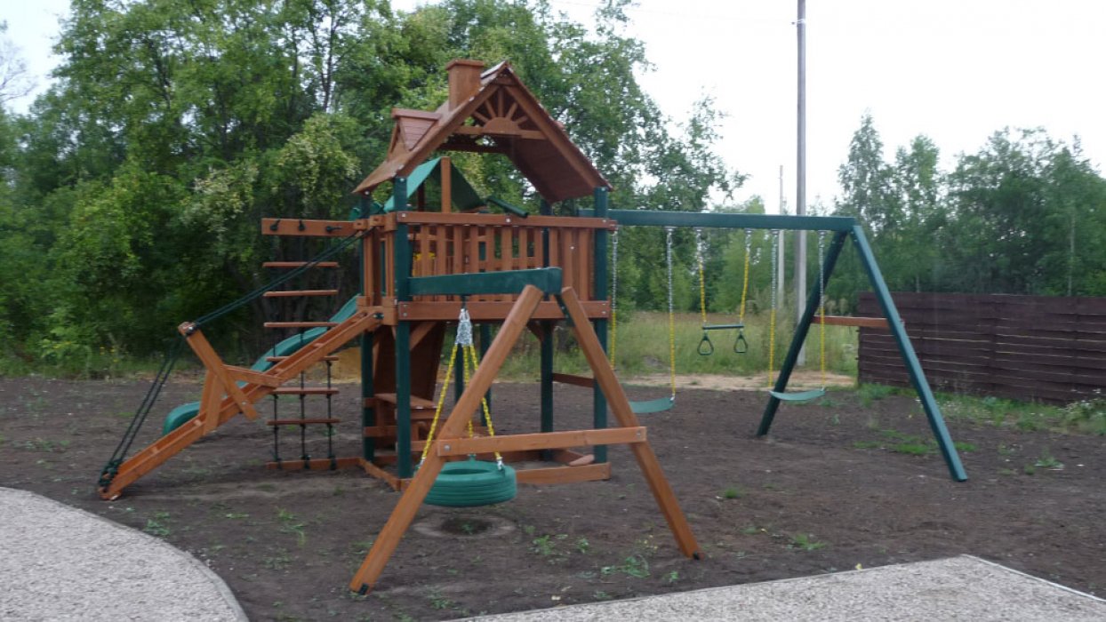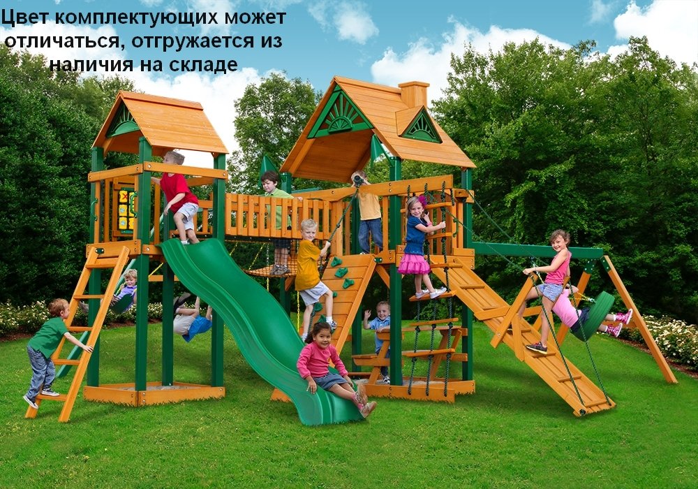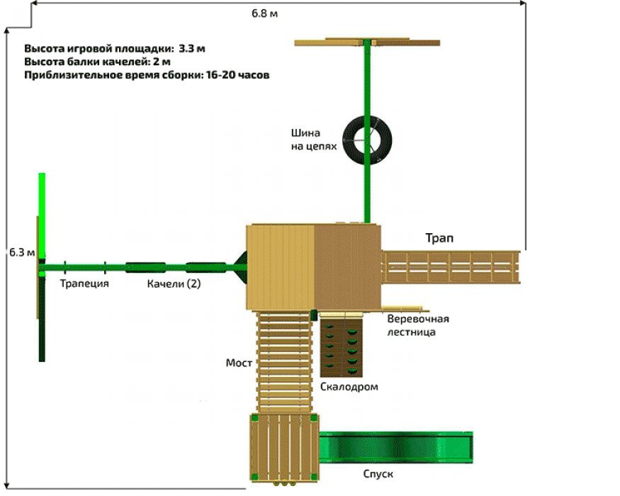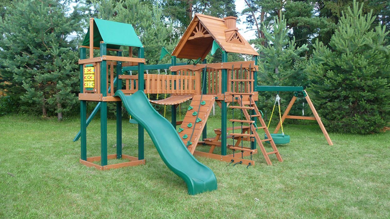 Большой игровой комплекс из дерева Гигант 1 состоит из двух фортов с переходным мостиком между ними, двух перекладин для качелей и горки. Дерево пропитано экологичным защитным составом от гниения и насекомых. Площадка рассчитана на детей в возрасте 3 — 11 лет. Даже самые активные малыши не смогут получить травмы во время игр, ведь детская площадка оборудована широким безопасным трапом с верёвочными поручнями, а все крепления и опоры отличаются повышенной прочностью.