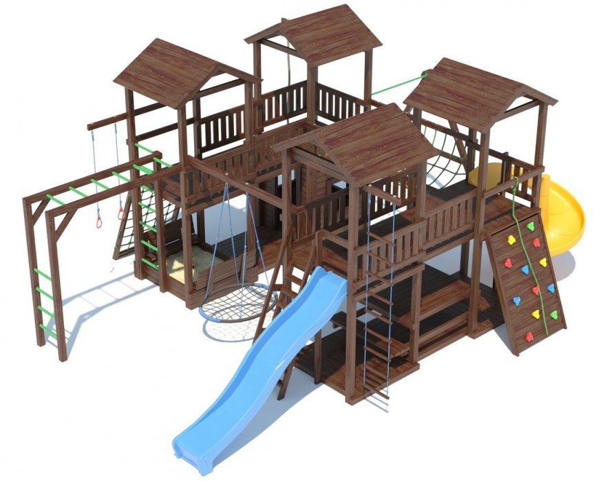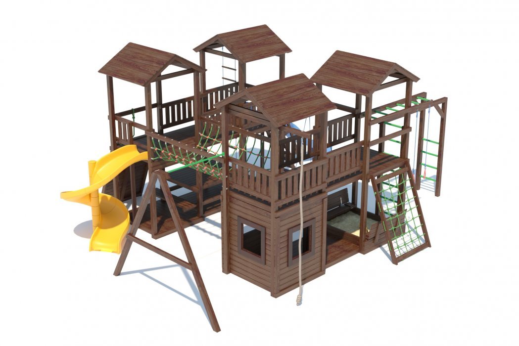 Основа детской игровой - спортивной конструкции – четыре башни с игровой платформой соединены мостиками и качельной балкой. Конструкция оснащена двускатными деревянными крышами, встроенным домиком, встроенным столиком с лавками, встроенной песочницей и дополнительной платформой в нижней части конструкции, пластиковыми волнообразным скатом и винтовым скатом с превосходной скользящей поверхностью, деревянной лестницей, широким скалодромом, канатной лестницей, деревянным рукоходом, шведской стенкой, сидением качели «гнездо», гимнастическим канатом, гимнастическими кольцами и подвесной лестницей. Для безопасности ребенка предусмотрены перила на лестнице, заборчики и ограждения над зонами препятствий (скалодром, канатная лестница, скат).