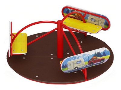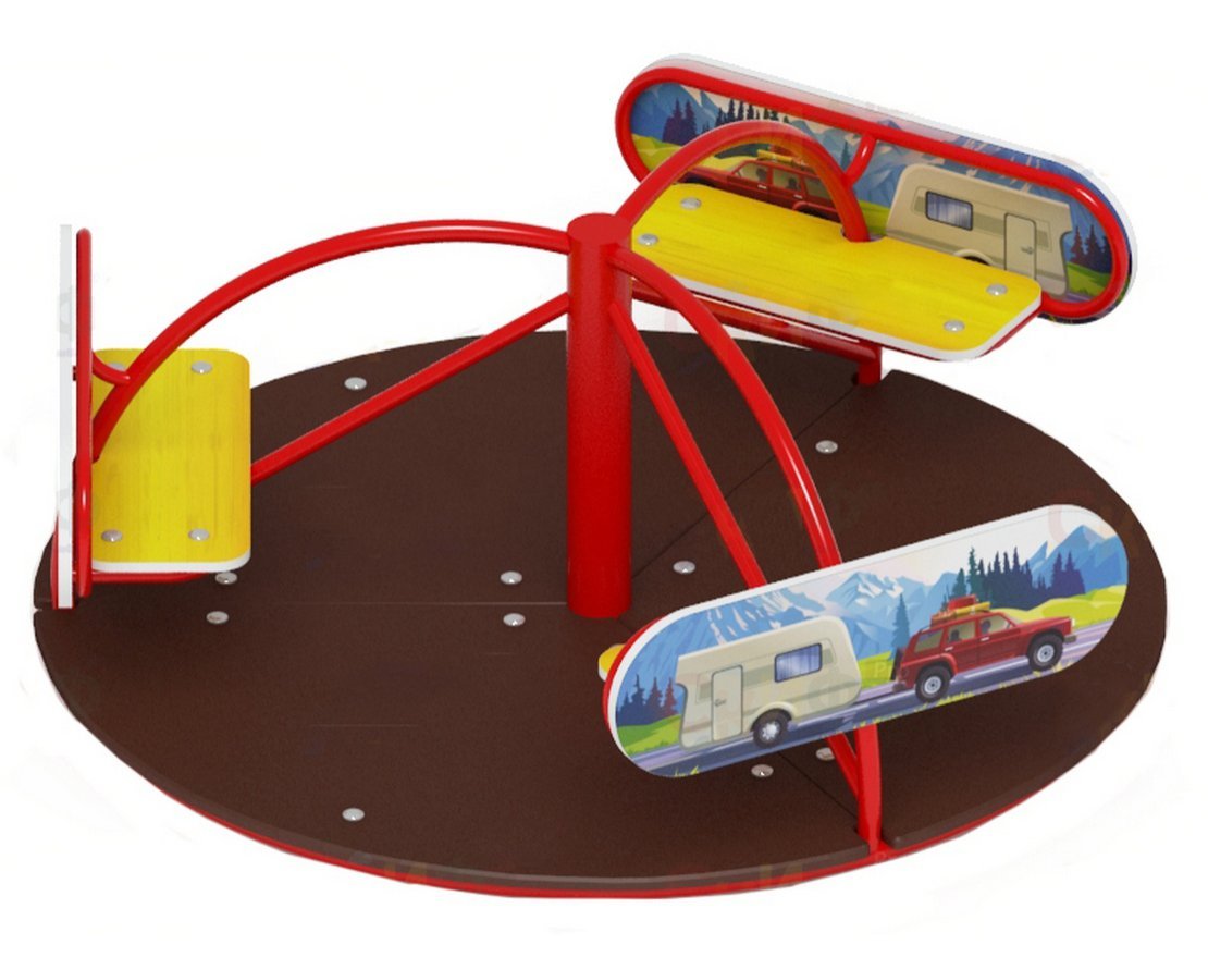 Выполнен из труб диаметром 89, 22, 32, 27 мм, металл имеет плавные радиусы, тщательную обработку швов, покрыт порошковой краской красного цвета. Полы состоят из влагостойкой ламинированной, анти-скользящей фанеры толщиной не менее 18 мм, выполнены в количестве шести сегментов размером 795х740х18 мм. Сиденья из фанеры не менее 18 мм, окрашены в желтый цвет размером 710х290 мм. Спинки из фанеры 18 мм, размером 750х240х18 мм, окрашены с нанесением принта «Путешествие». Размер собранного каркаса диаметр 1600 мм, высота 600 мм.