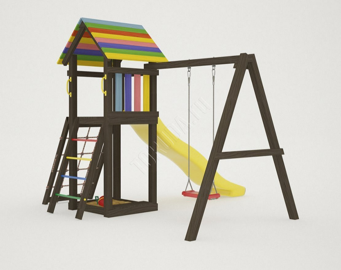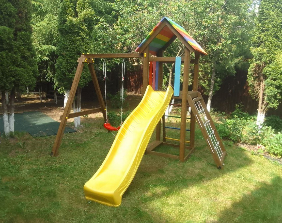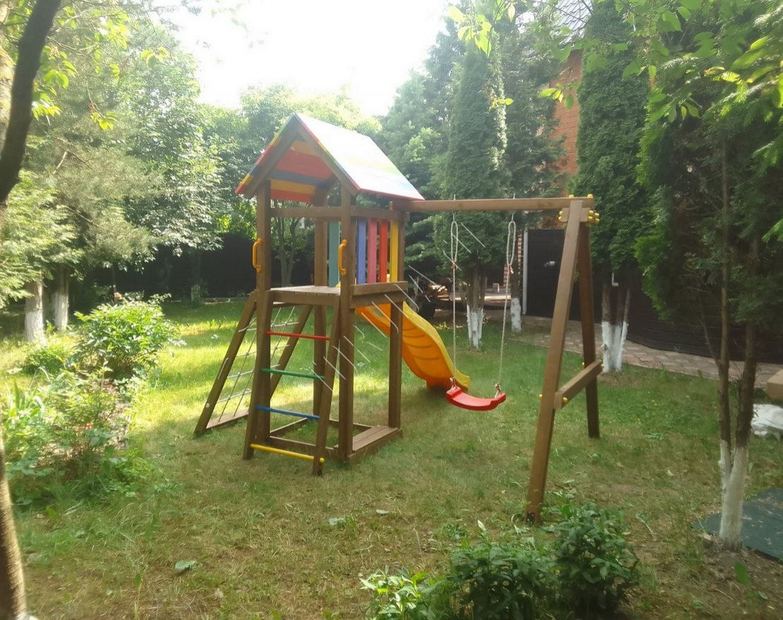 - Домик закрыт сверху деревянным перекрытием – оно скрывает от прямых солнечных лучей и позволяет передохнуть на свежем воздухе. Комплекс универсален, поскольку включает в себя столь любимые детьми горку и качели.