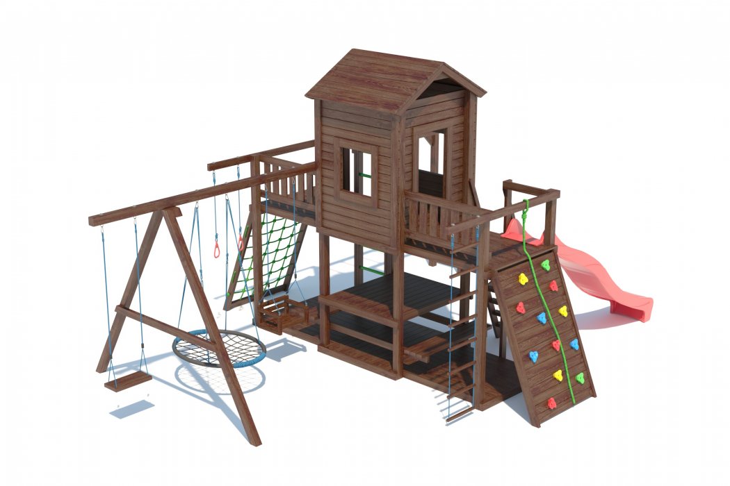 Основа детской игровой - спортивной конструкции - башня с террасой и игровой платформой. Конструкция оснащена двускатной деревянной крышей, встроенным домиком в верхней части конструкции, встроенным столиком с лавками в нижней части конструкции, дополнительной платформой в основании конструкции, пластиковым волнообразным скатом с превосходной скользящей поверхностью, деревянной лестницей, широким скалодромом, канатной лестницей, деревянным рукоходом, шведской стенкой, приставными качелями, сидением качели «гнездо», сидением качели «малютка», гимнастическими кольцами, подвесной лестницей. Для безопасности ребенка предусмотрены перила на лестнице, заборчики и ограждения над зонами препятствий (скалодром, канатная лестница, скат).