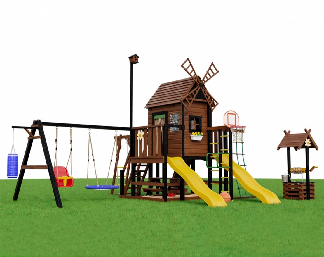 Игровой комплекс Мулен 3 с колодцем — это уютный деревянный домик, наполненный атмосферой приключений. Его узнаваемый силуэт с декоративными лопастями на крыше перенесет детей в мир сказок, где можно представить себя отважным путешественником, хозяином мельницы или капитаном воздушного корабля. Площадка сочетает различные игровые и спортивные элементы, помогая ребенку развивать ловкость, силу и координацию. Лестницы, канаты, качели и горка превращают игру в увлекательное приключение, в котором важно не только фантазировать, но и двигаться. Внутри домика продумано всё до мелочей — каждый уголок наполнен возможностями для игры, творчества и удобства. На втором этаже маленьких художников ждет доска для рисования, где можно воплощать свои фантазии. Два отдельных столика со стульчиками позволяют детям играть, рисовать или устраивать чаепитие, не мешая друг другу. А просторная песочница под домиком станет местом для совместных экспериментов с песочными замками — здесь хватит места всем! Два раздельных входа делают пространство более просторным и удобным, создавая еще больше возможностей для веселой и динамичной игры.