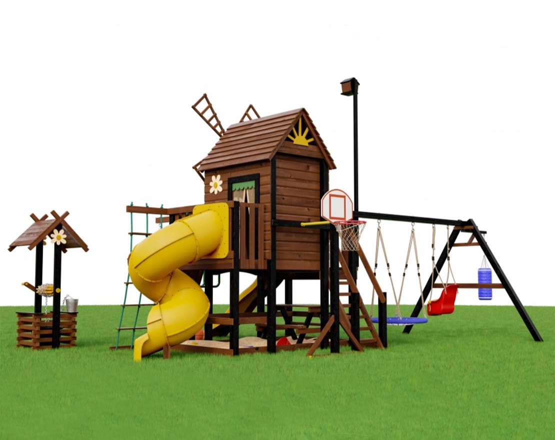 Игровой комплекс Мулен 5 с колодцем — это уютный деревянный домик, наполненный атмосферой приключений. Его узнаваемый силуэт с декоративными лопастями на крыше перенесет детей в мир сказок, где можно представить себя отважным путешественником, хозяином мельницы или капитаном воздушного корабля. Площадка сочетает различные игровые и спортивные элементы, помогая ребенку развивать ловкость, силу и координацию. Лестницы, канаты, качели и горка превращают игру в увлекательное приключение, в котором важно не только фантазировать, но и двигаться. Внутри домика продумано всё до мелочей — каждый уголок наполнен возможностями для игры, творчества и удобства. На втором этаже маленьких художников ждет доска для рисования, где можно воплощать свои фантазии. Два отдельных столика со стульчиками позволяют детям играть, рисовать или устраивать чаепитие, не мешая друг другу. А просторная песочница под домиком станет местом для совместных экспериментов с песочными замками — здесь хватит места всем! Два раздельных входа делают пространство более просторным и удобным, создавая еще больше возможностей для веселой и динамичной игры.