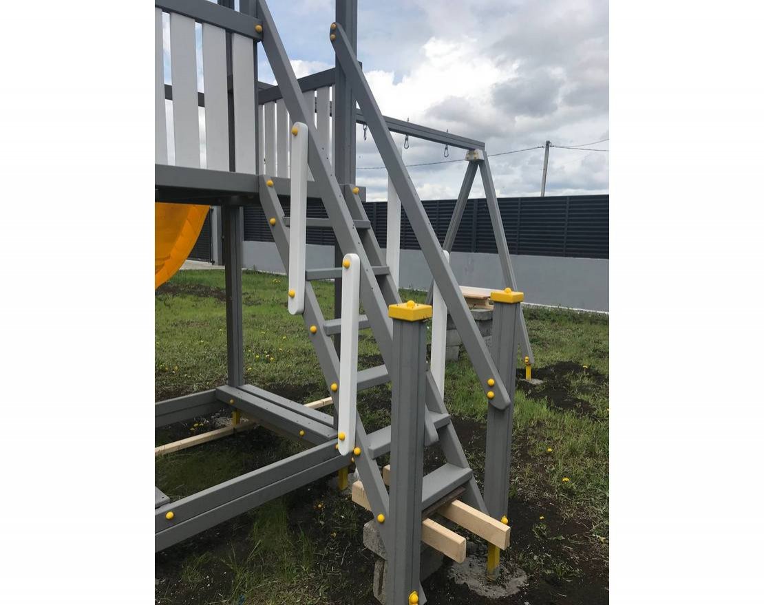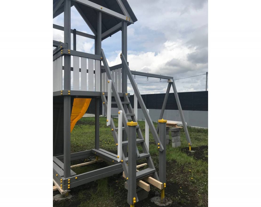 Для максимальной защиты ребёнка от травм, все углы имеют закруглённую форму, крепеж надежно скрыт пластиковыми заглушками. Опоры изготовлены из клееного бруса толщиной 90*90 мм.