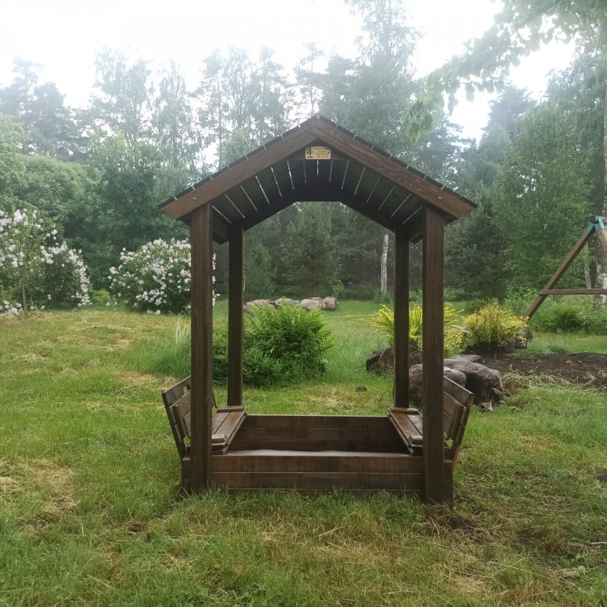 Конструкция состоит из каркаса, двускатной деревянной крыши и встроенной песочницей с крышкой «трансформер».