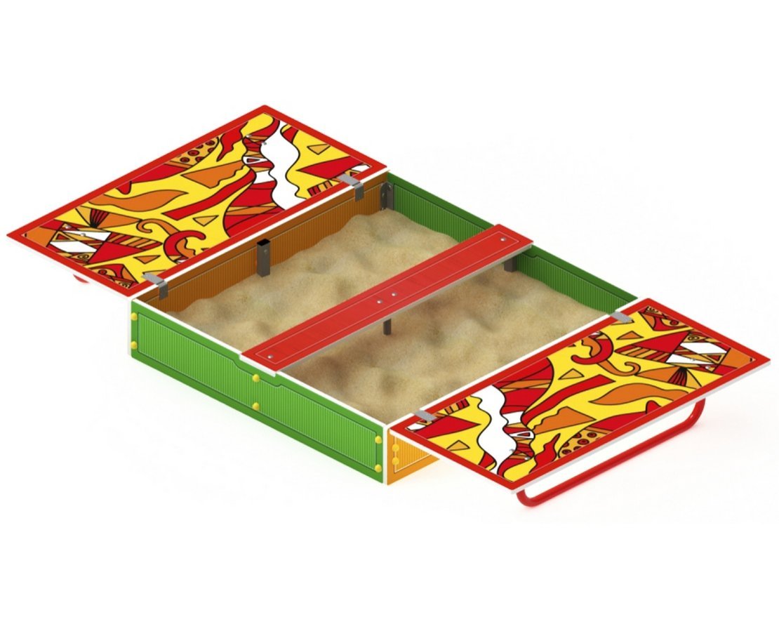 Выполнена из влагостойкой фанеры толщиной не менее 18 мм, кромки фанеры тщательно шлифованы, окрашена с нанесением рисунка. Крышка оснащена ручками из стальной трубы диаметром 22 мм, ручки окрашены порошковой краской в красный цвет. Крышка крепиться к бортам при помощи петель. Размеры: 1200х580 мм.