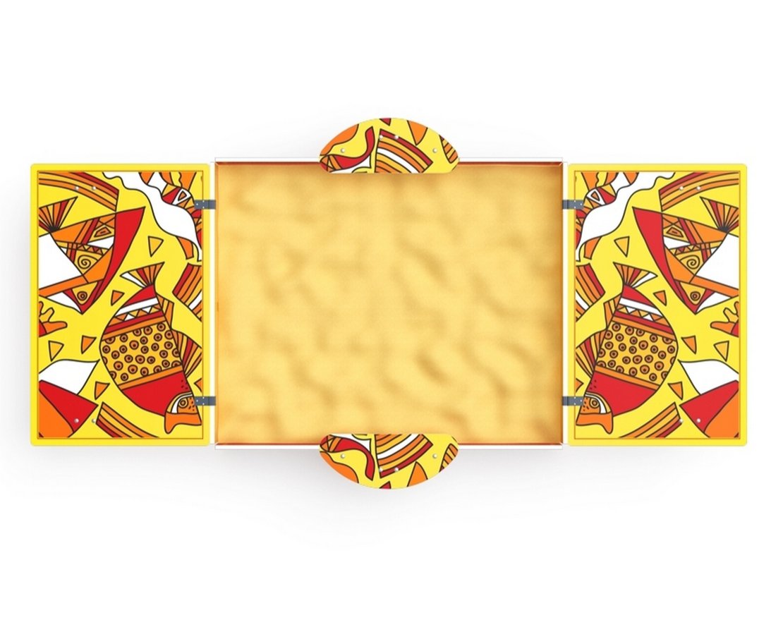Выполнена из влагостойкой фанеры толщиной не менее 18 мм, кромки фанеры тщательно шлифованы, окрашена с нанесением рисунка (рыбы). Крышка оснащена - ручками из стальной трубы диаметром 27 мм, ручки окрашены порошковой краской в цвет графит серый. Крышка крепиться к бортам при помощи петель. Размеры 1180х750 мм.
