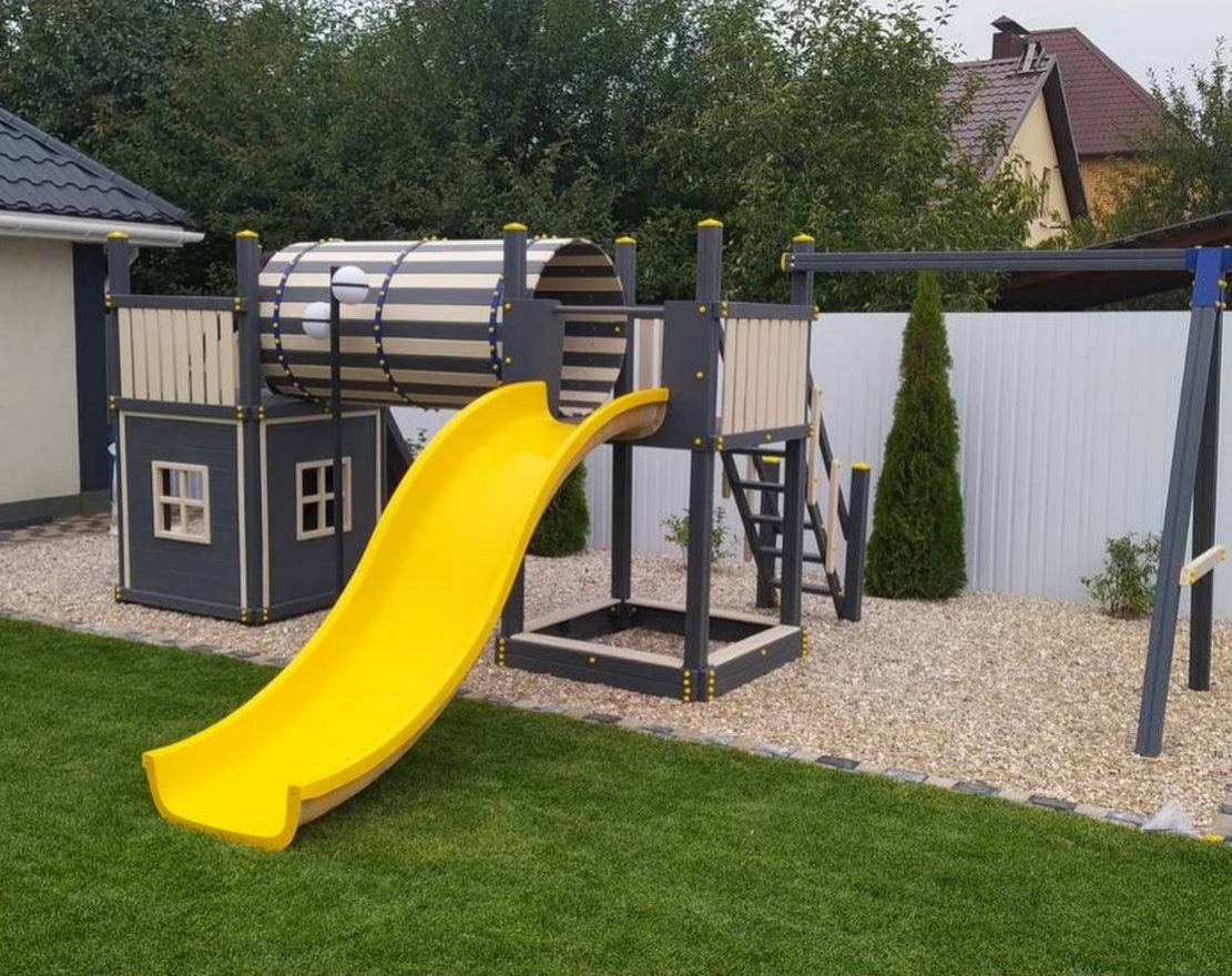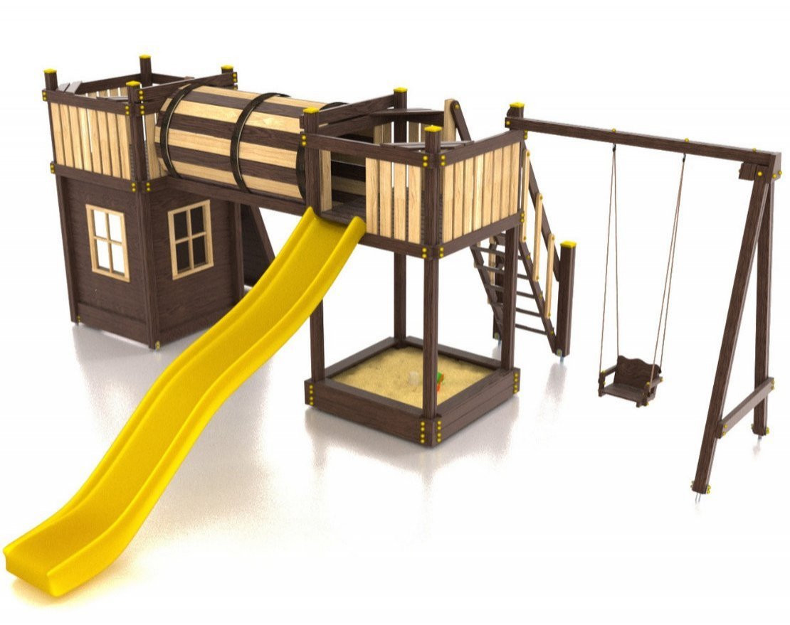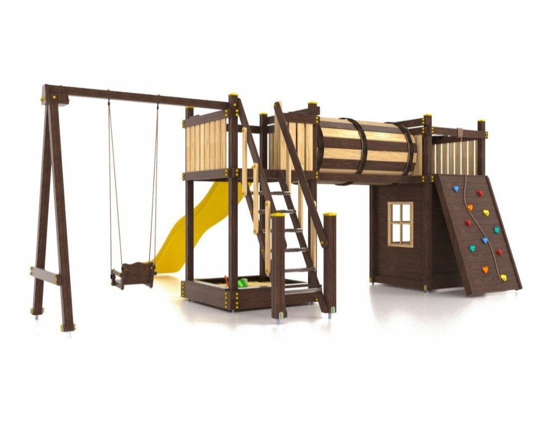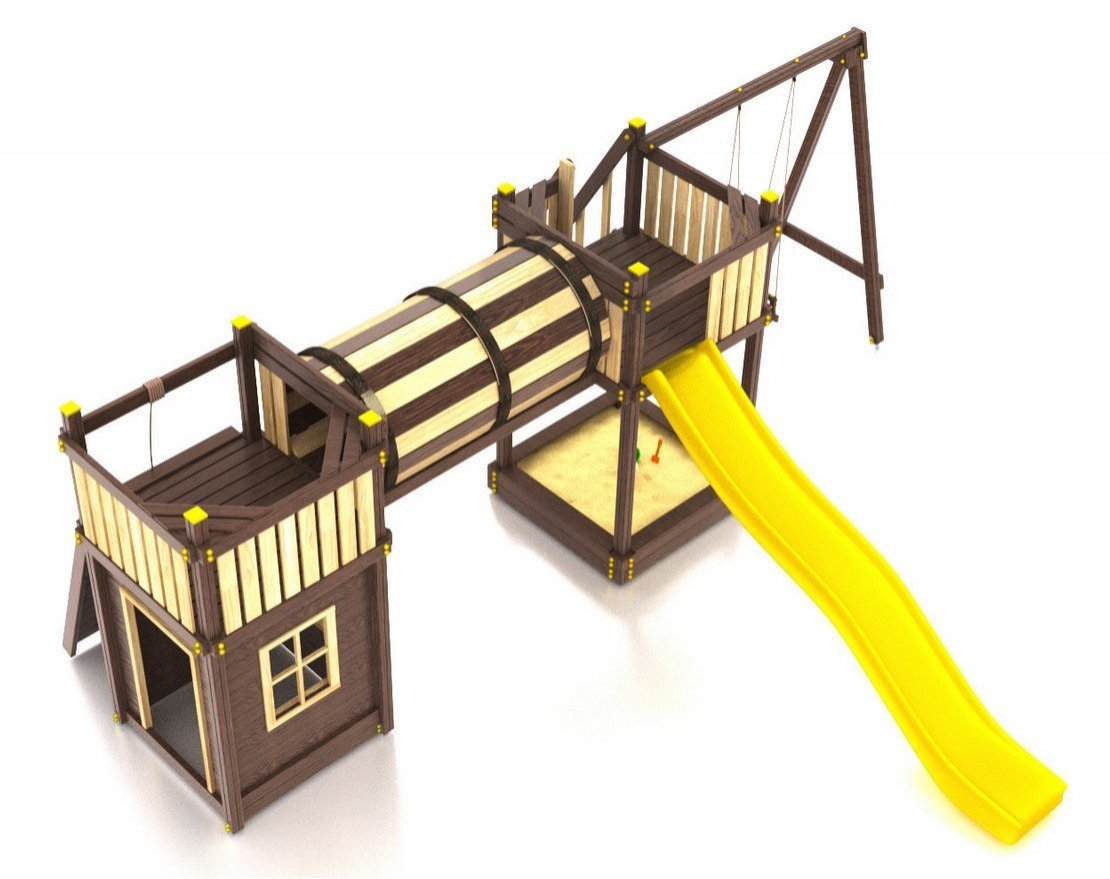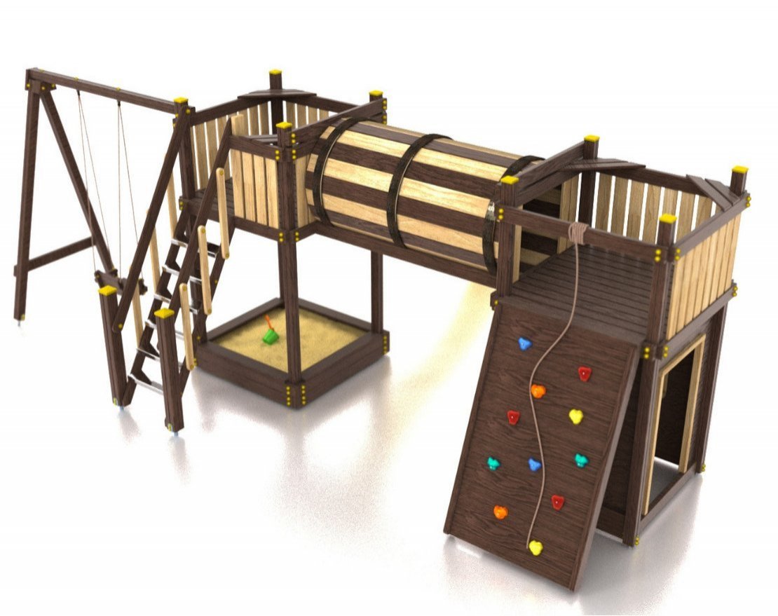 Для максимальной защиты ребёнка от травм, все углы имеют закруглённую форму, крепеж скрыт пластиковыми заглушками. Опоры изготовлены из клеёного бруса толщиной 90*90 мм.