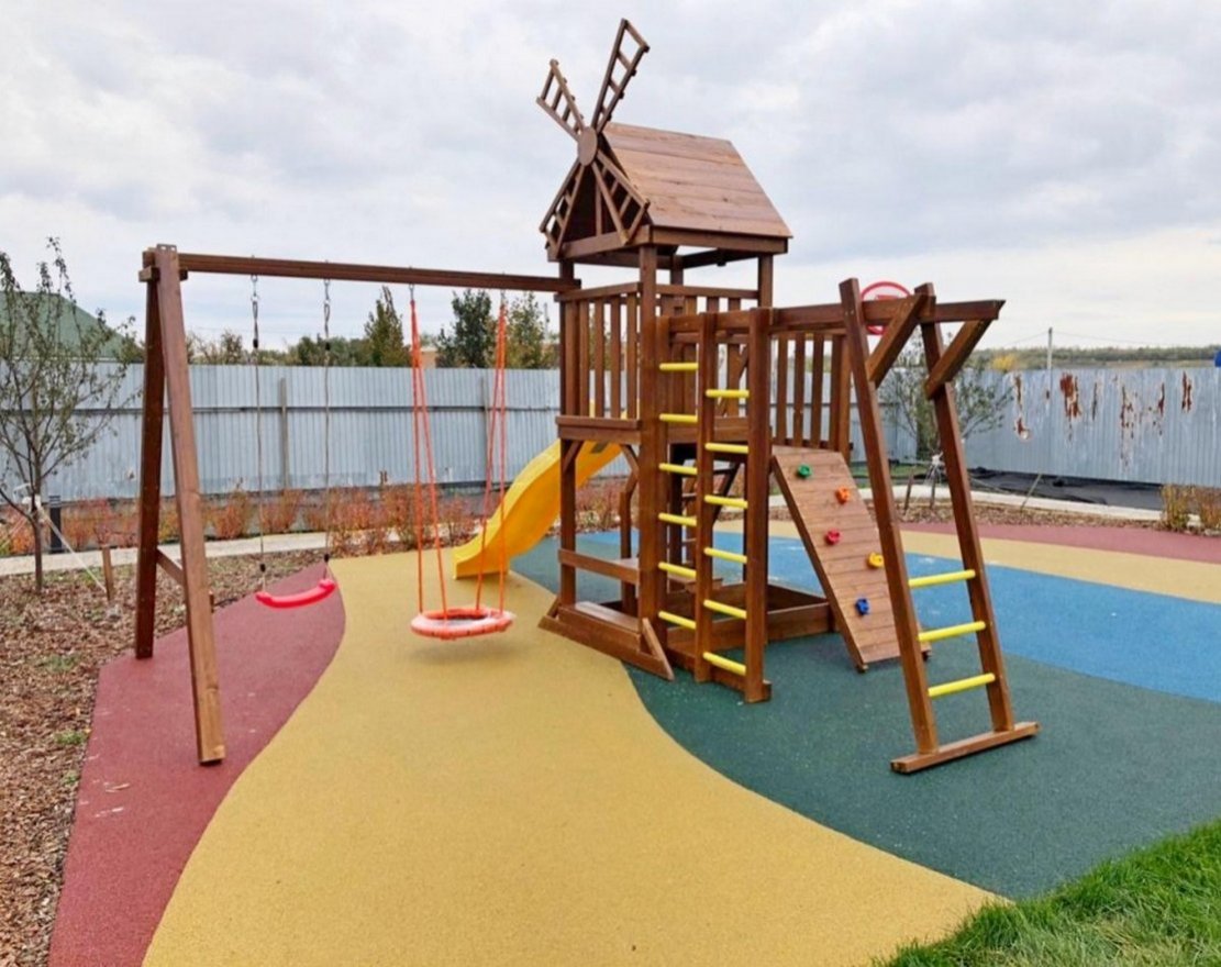 Детская игровая площадка из дерева с покрытием из резиновой крошки - это готовое решение, которое включает в себя различные элементы для развития детей, такие как качели, скалодром и горка.