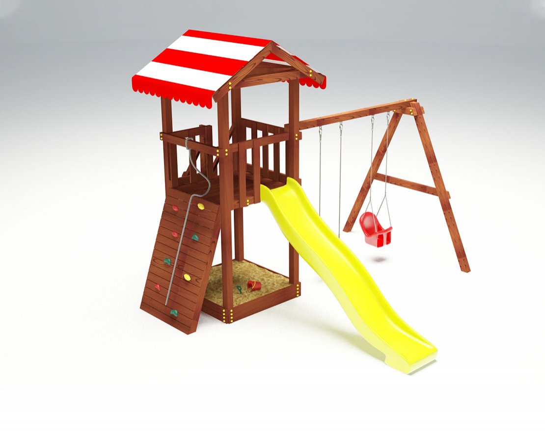 Комплекс имеет небольшие размеры и занимает минимум пространства. Большого выбора игрового оборудования тут нет. Однако это не способ экономии, а скорее формат, концепция позволяющая сделать площадку компактной. Каркас - деревянный. Положительно сказывается на сроке службы применение клееного бруса. Он не меняет форму с годами, не боится сырости или снега.