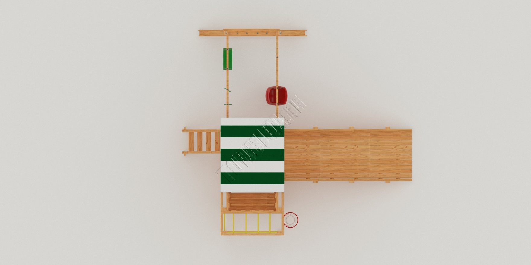 Укреплять мышечный каркас нужно с детства, бросая мяч в баскетбольное кольцо, вися на турнике и кольцах, карабкаясь по шведской стенке, канату, сетке-лазалке. Все это многообразие спортивных снарядов присутствует в этой площадке. Для большей радости качели «Лодочка» и «Люкс» со спинкой.