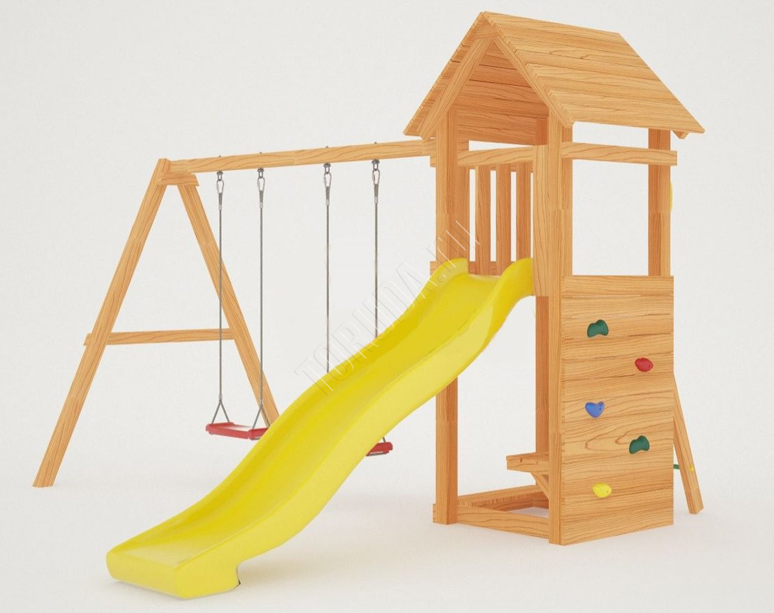 Основной материал натуральный и экологичный – это шлифованный клееный брус, края которого скруглены. Занозы и ссадины исключены. Детская площадка безопасна: конструкция рамы произведена согласно ГОСТ, все крепежи закрыты заглушками, а подвесное снаряжение сертифицировано и создано специально для детей в Бельгии.