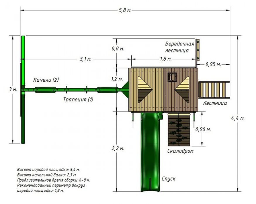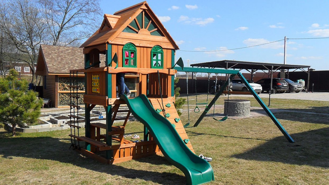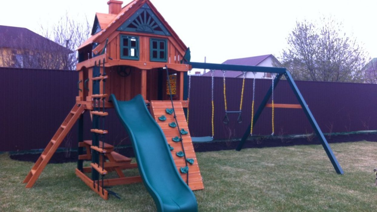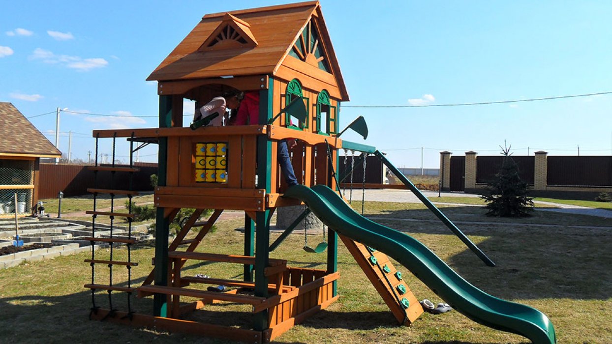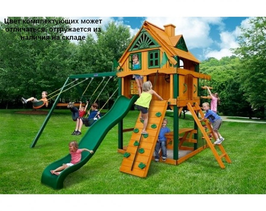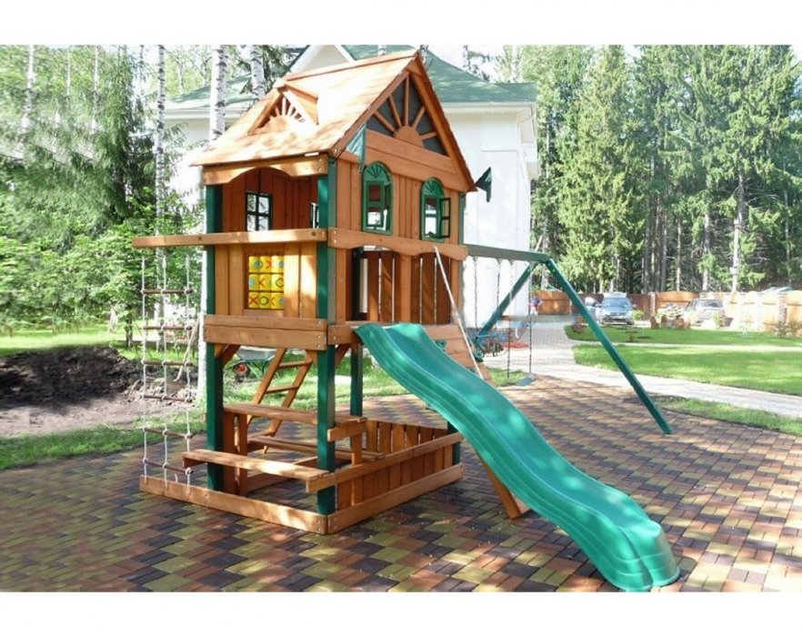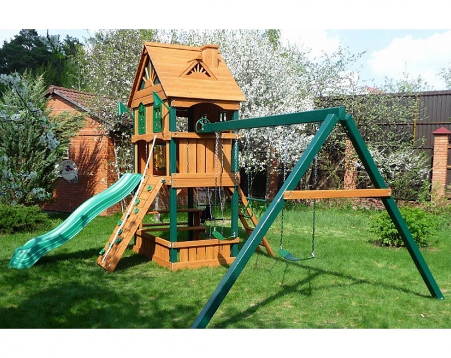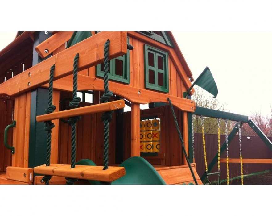 Детская игровая площадка Зоренька с большим деревянным фортом оснащен рулем, телескопом и перископом, флажками и колокольчиком. Дерево, из которого изготовлена детская площадка, пропитано специальным составом, защищающим от гниения, солнечных лучей и насекомых.