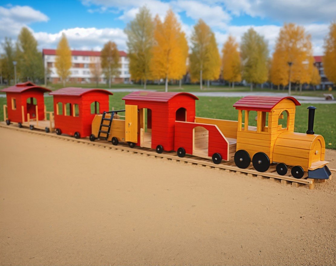 Игровой поезд состоит из 7 уникальных вагонов, каждый длиной 213см. и шириной 122см., а общая длина поезда почти 15 метров! Каждый из них предлагает что-то свое, с чем дети могут взаимодействовать и все они доставляют массу удовольствия. Осуществите мечту вашего ребенка, пусть у него будет свой собственный, персональный локомотив на игровой площадке!