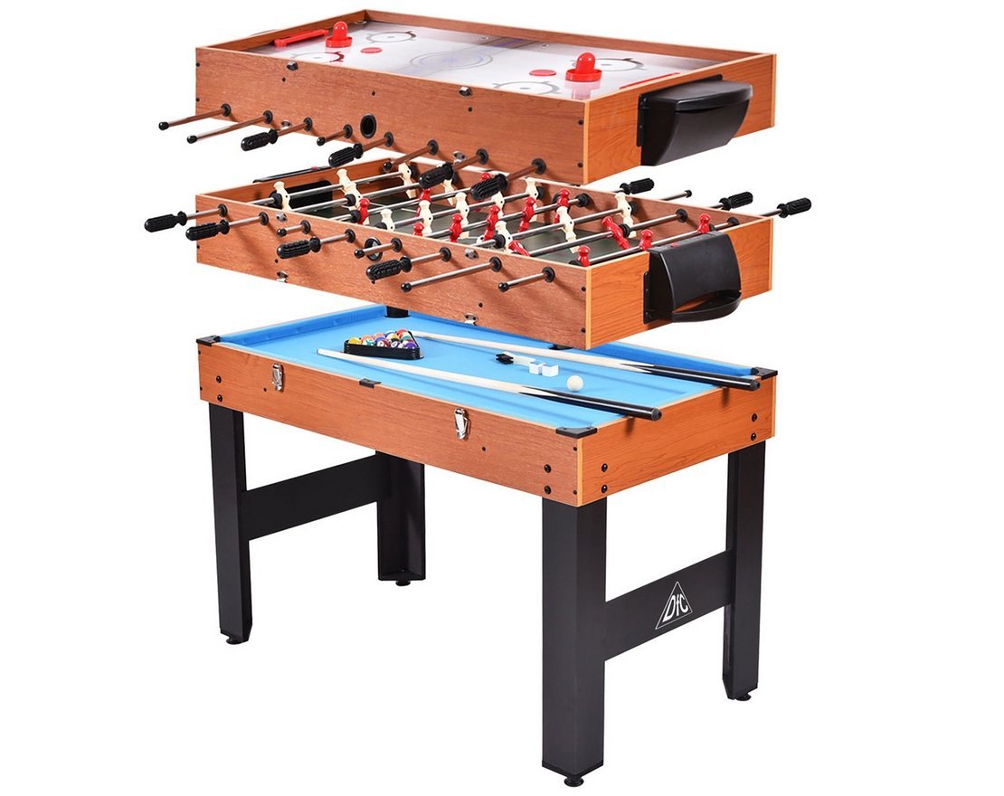 Многофункциональная модель игрового стола для домашнего применения. Стол - трансформер 3 игры в 1: бильярд, хоккей, кикер. Для выбора нужной игры необходимо установить новую игровую поверхность на основу стола.