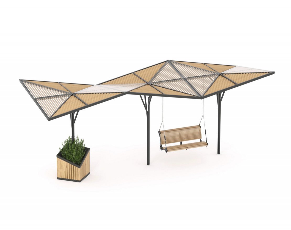 Пергола с геометрической крышей и подвесными парковыми качелями. Конструкция защищает от прямых солнечных лучей. Помимо этого, пергола украшает и оптимизирует пространство.