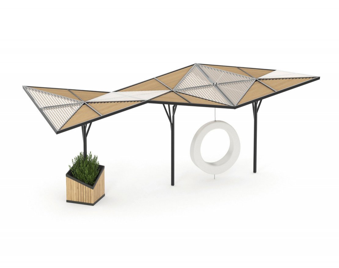 Пергола с геометрической крышей и подвесными парковыми качелями. Конструкция защищает от прямых солнечных лучей. Помимо этого, пергола украшает и оптимизирует пространство.