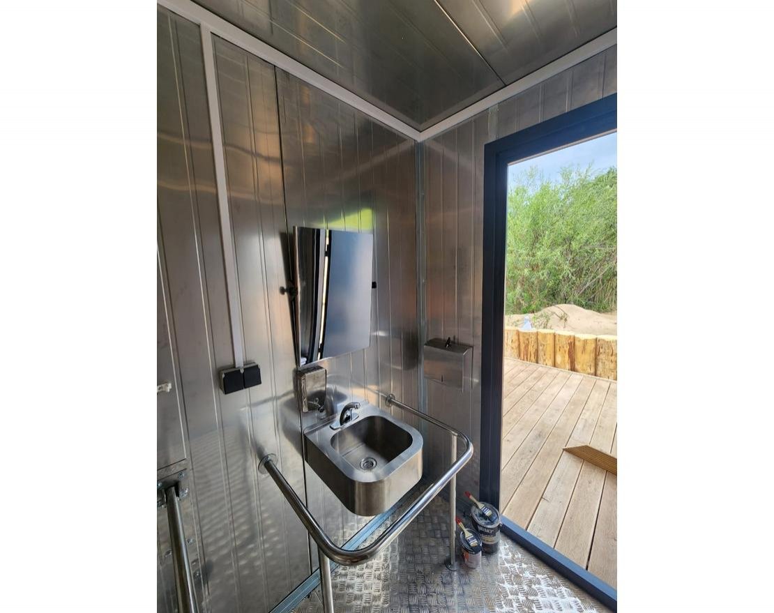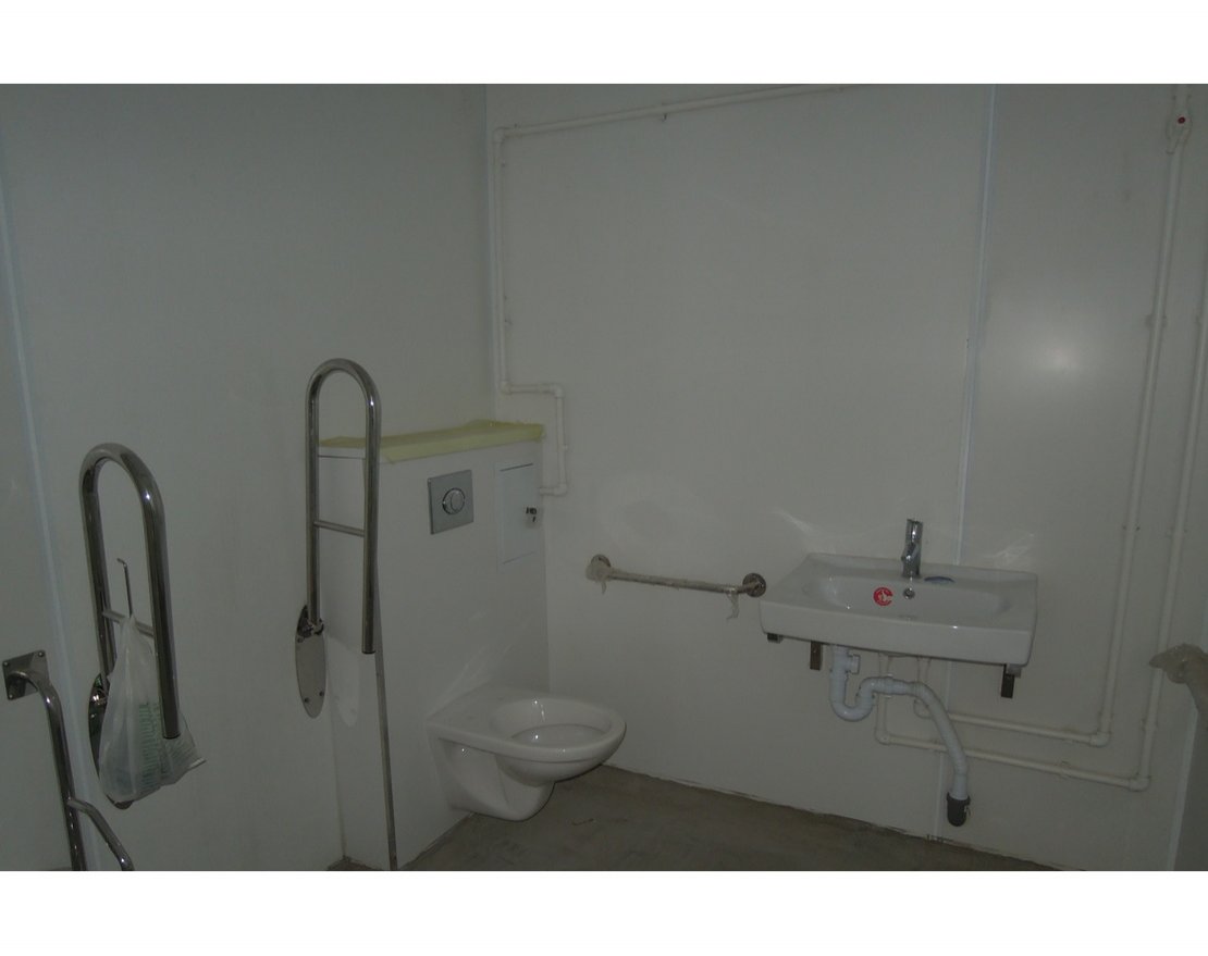 Помещение для инвалидов оборудовано специальными поручнями. В зависимости от места установки может комплектоваться пандусом для колясок. Наиболее подходящая модель для установки в общественных местах и на массовых мероприятиях.