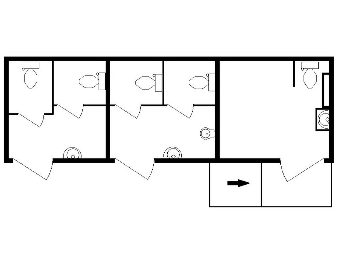 Данный модуль представляет из себя 3-секционный туалет, одна из секций которого предназначена для маломобильных групп населения (для инвалидов).
