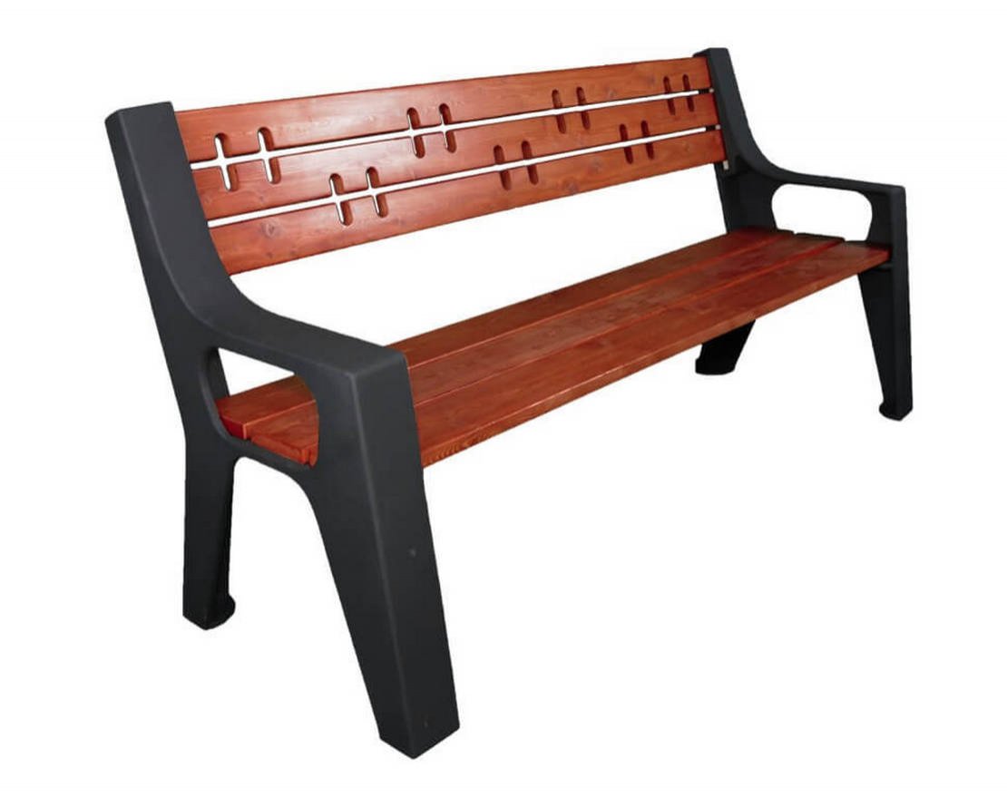 Сиденье и спинка сделаны из бруса лиственницы. Светлая древесина пропитана защитным средством. Рабочая поверхность тщательно отшлифована и покрыта прозрачным слоем водоустойчивого лака.