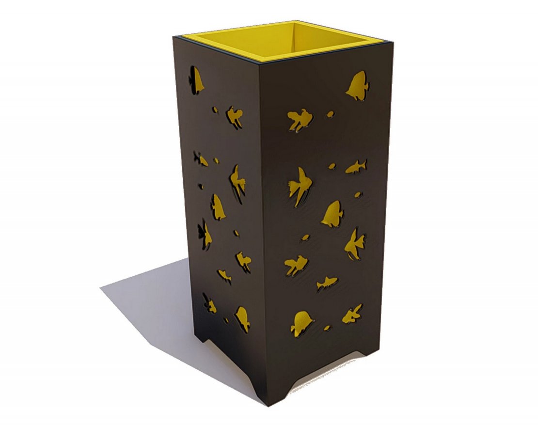 Мусорная урна «Аквариум» предназначена для установки на городских улицах и прогулочных зонах. Декор представляет собой силуэты тропических рыб, вырезанных лазером на стальном листе.