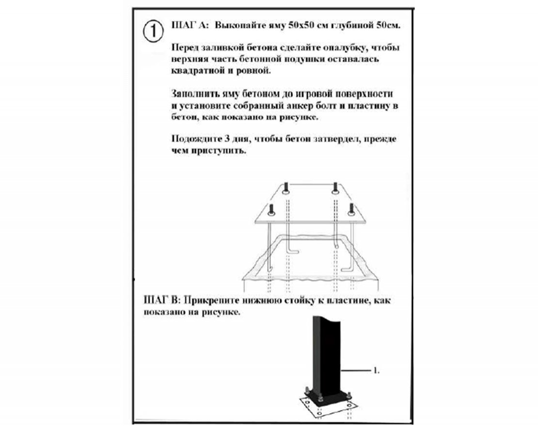 Основание стойки бетонируется с помощью 4 анкеров (в комплекте), размер ямы под площадку должен составлять 50 х 50 см.