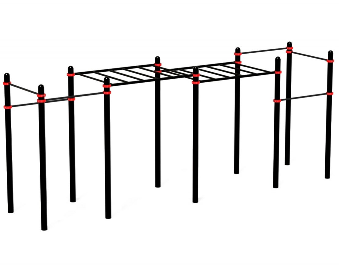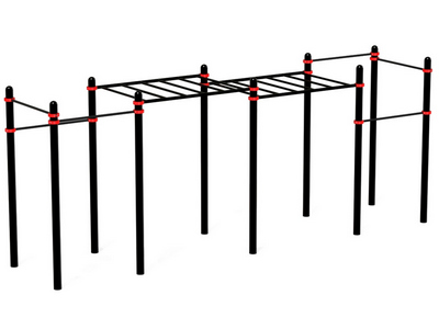 Комплекс предназначен для эксплуатации во дворах и на спортивных площадках, поэтому все металлические элементы максимально защищены от коррозийных процессов. Основное преимущество гимнастического комплекса для воркаута заключается в том, что вы получаете сразу несколько снарядов для индивидуальных или даже групповых занятий. Они позволяют создать настоящую полосу препятствий.