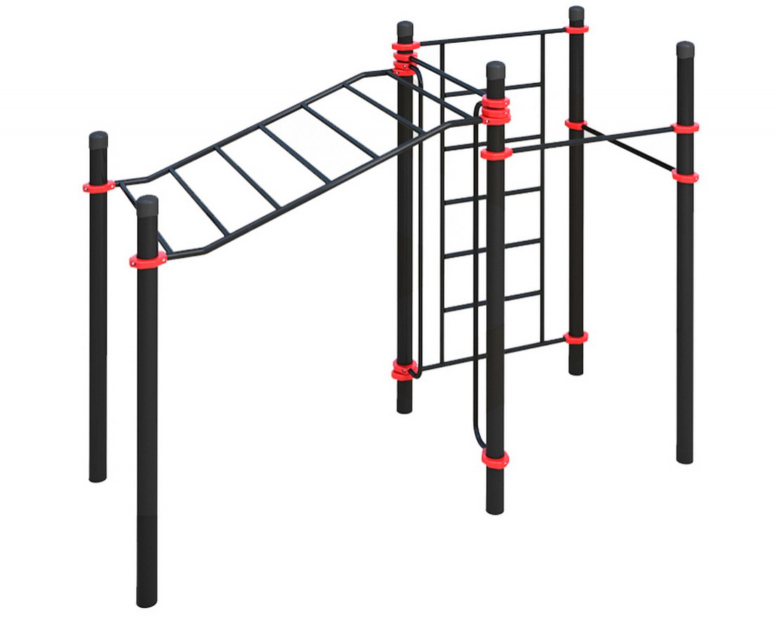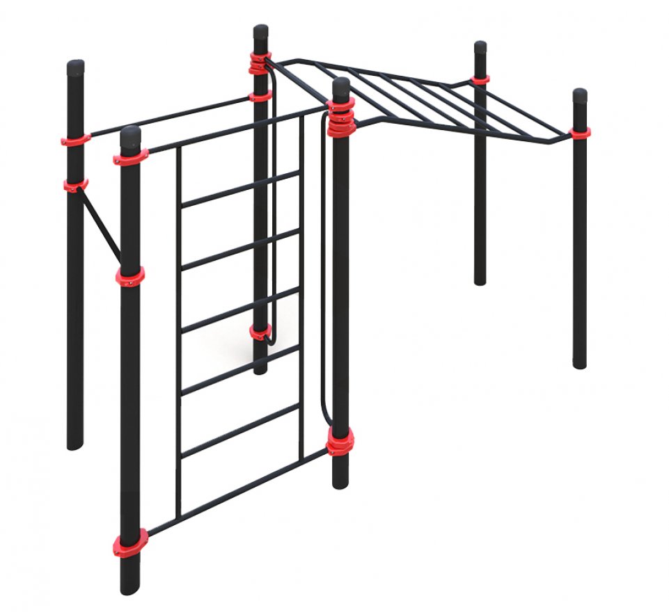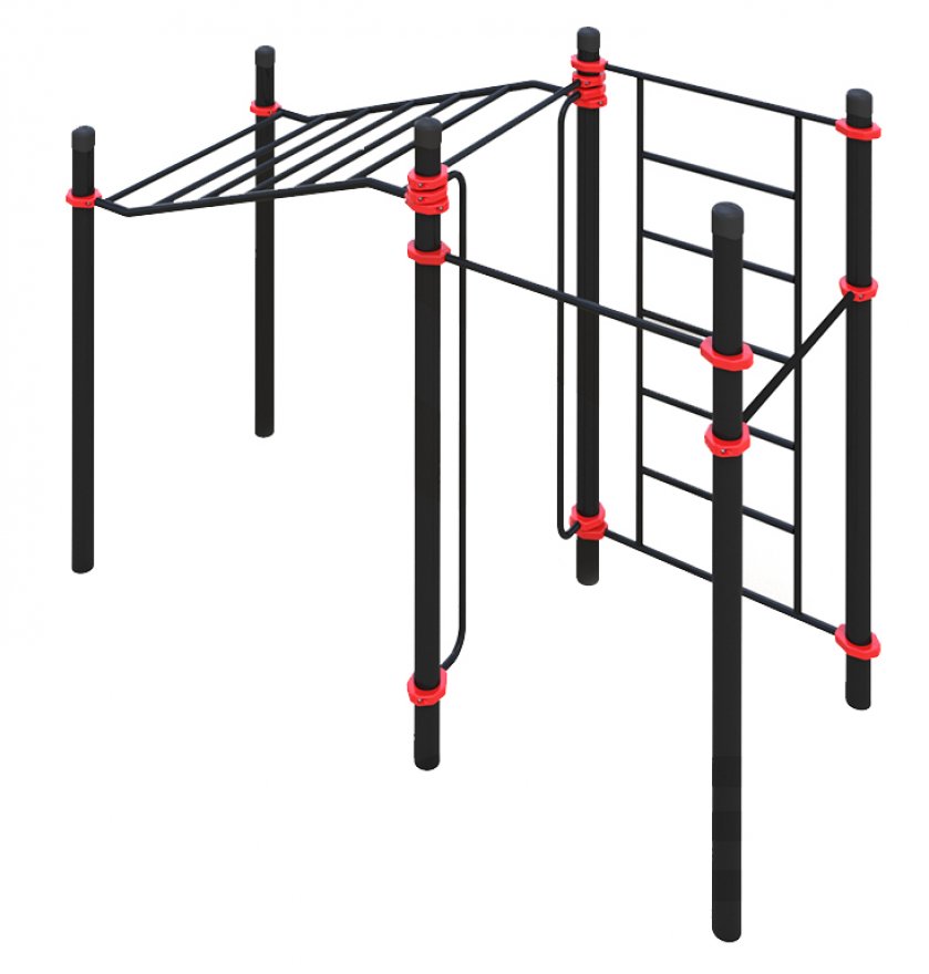 Комплекс состоит из шести опорных столбов высотой: 3 шт. - 2530 мм, 1 шт. - 2300 мм, 2 шт. - 2000 мм, трех перекладин для подтягиваний длиной 1200 мм, шведской стенки и рукохода в подъем. Элементы крепятся к опорным столбам при помощи хомутов. Высота фиксации перекладин для подтягиваний: 1 шт. - 2350 мм, 1 шт. - 2100 мм и 1 шт. - 1800 мм. Шведская стенка крепится на высоте 2450 мм. Состоит из перекладин, расстояние между которыми 373 мм. Высота шведской стенки - 2073 мм, ширина - 1200 мм. Рукоход в подъем крепится к опорным столбам на высоте: 1700 мм - в нижней части и 2166 мм - в верхней части, длина рукохода 1790 мм. Комплекс оснащен поручнями для инвалидов-колясочников.