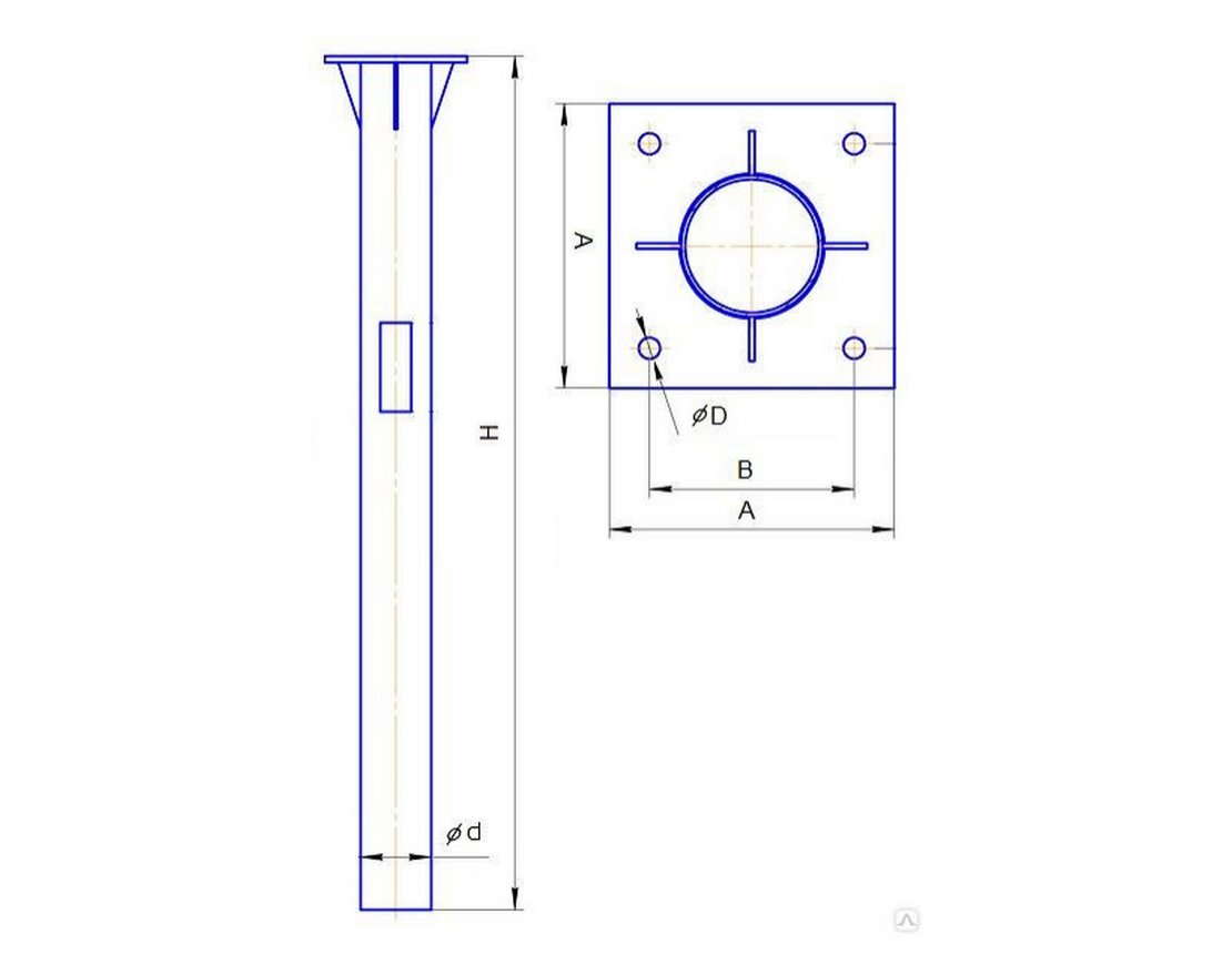 Фундаменты опор наружного освещения представляют собой крепежные элементы специализированного типа, состоящие из двух основных элементов – трубы круглого сечения и фланца квадратной формы. В качестве конструкционного материала используют бесшовный трубный прокат, который характеризуется высокой устойчивостью к механическим нагрузкам.